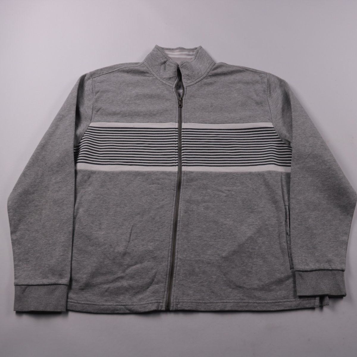 Мужская толстовка Tu на молнии с воротником-стойкой, серого меланжевого цвета с контрастной полосой на груди. Подойдёт для повседневной носки и прогулок в прохладную погоду, удобно сочетать с джинсами и спортивными брюками. Практичный плюс — молния по всей длине, можно быстро надеть и регулировать тепло.
