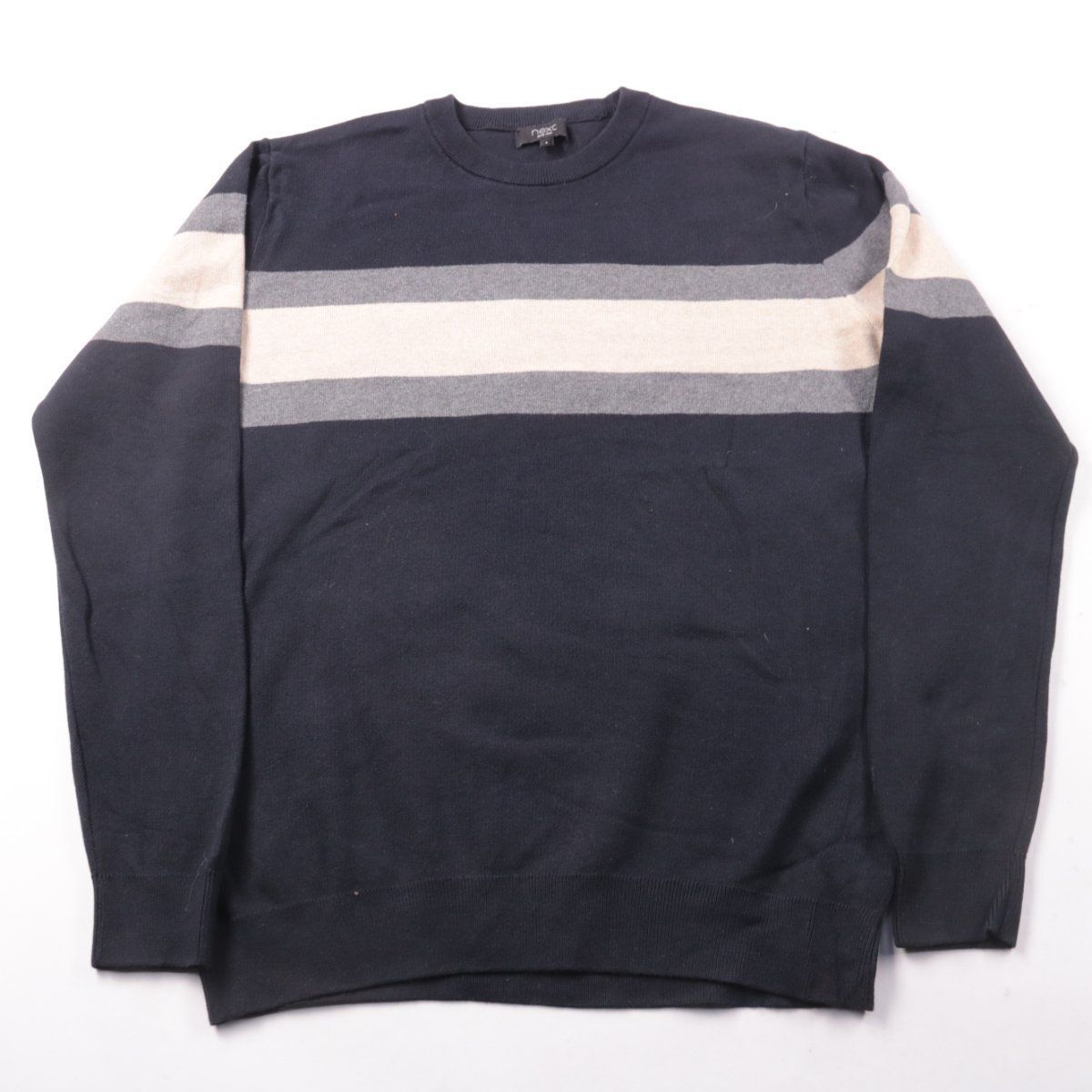 Мужской джемпер Next из хлопкового трикотажа, тёмно-синий с контрастными полосами на груди и рукавах. Подойдёт для повседневной носки и многослойных образов в прохладную погоду. Хлопок хорошо дышит и комфортен в помещении.