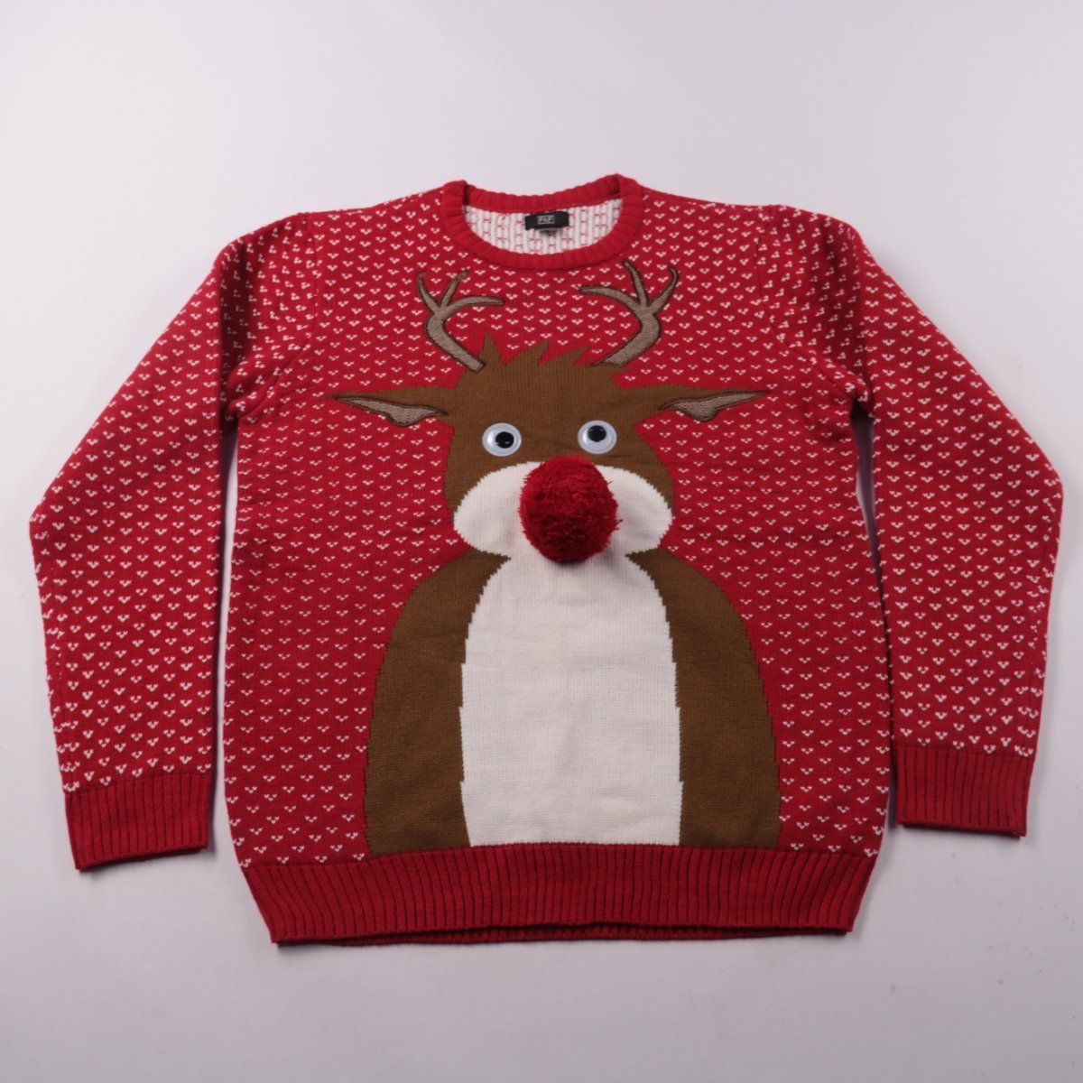 Мужской вязаный свитер F&F красного цвета с новогодним рисунком оленя и объёмным носом. Подойдёт для зимних прогулок и праздничных мероприятий, хорошо смотрится с джинсами. Акриловая вязка проста в уходе и быстро сохнет.