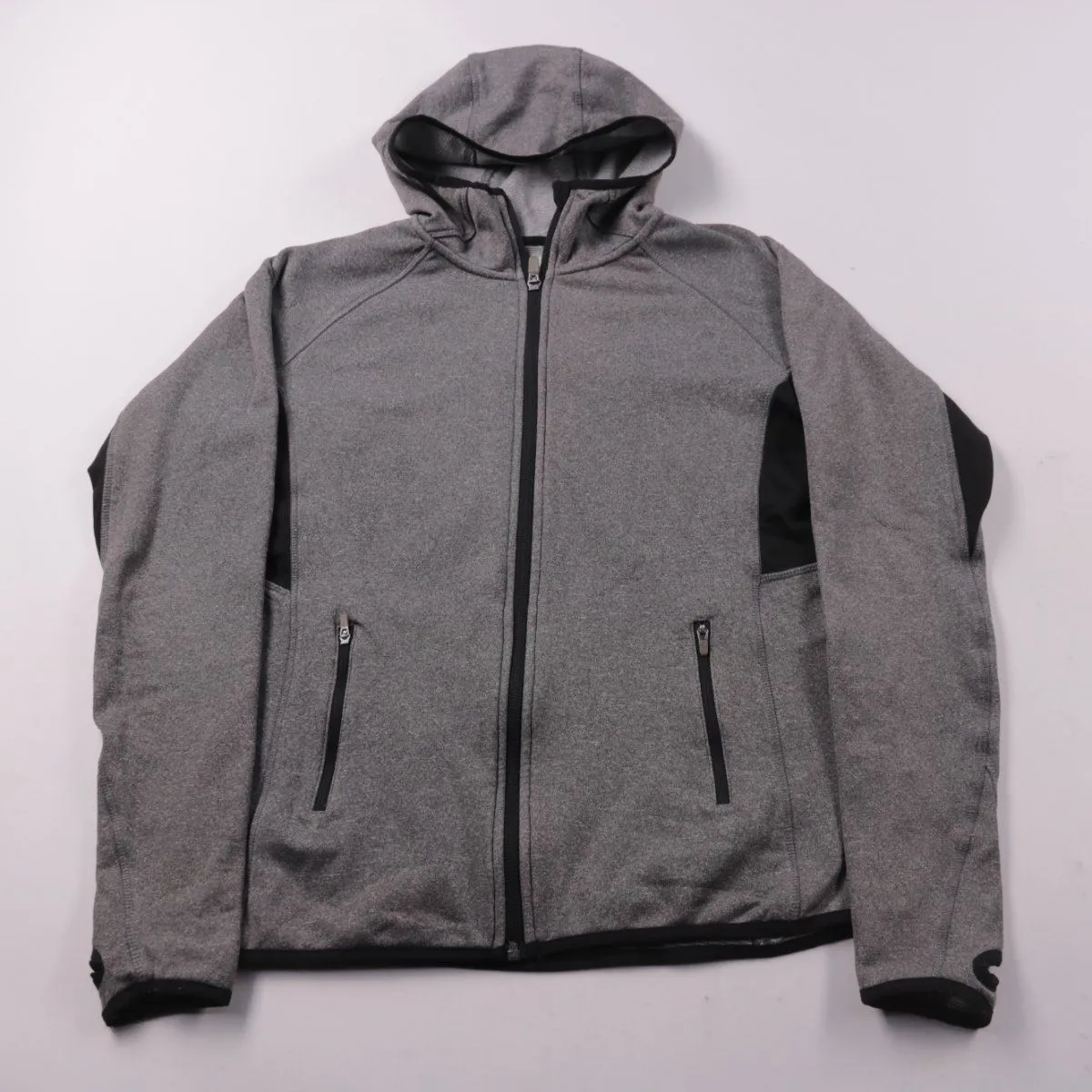 Мужское худи H&M Sport на молнии с капюшоном, серого цвета с чёрными вставками. Подойдёт для тренировок и прогулок в прохладную погоду, есть боковые карманы на молнии. Эластичный материал лучше садится по фигуре и не стесняет движений.
