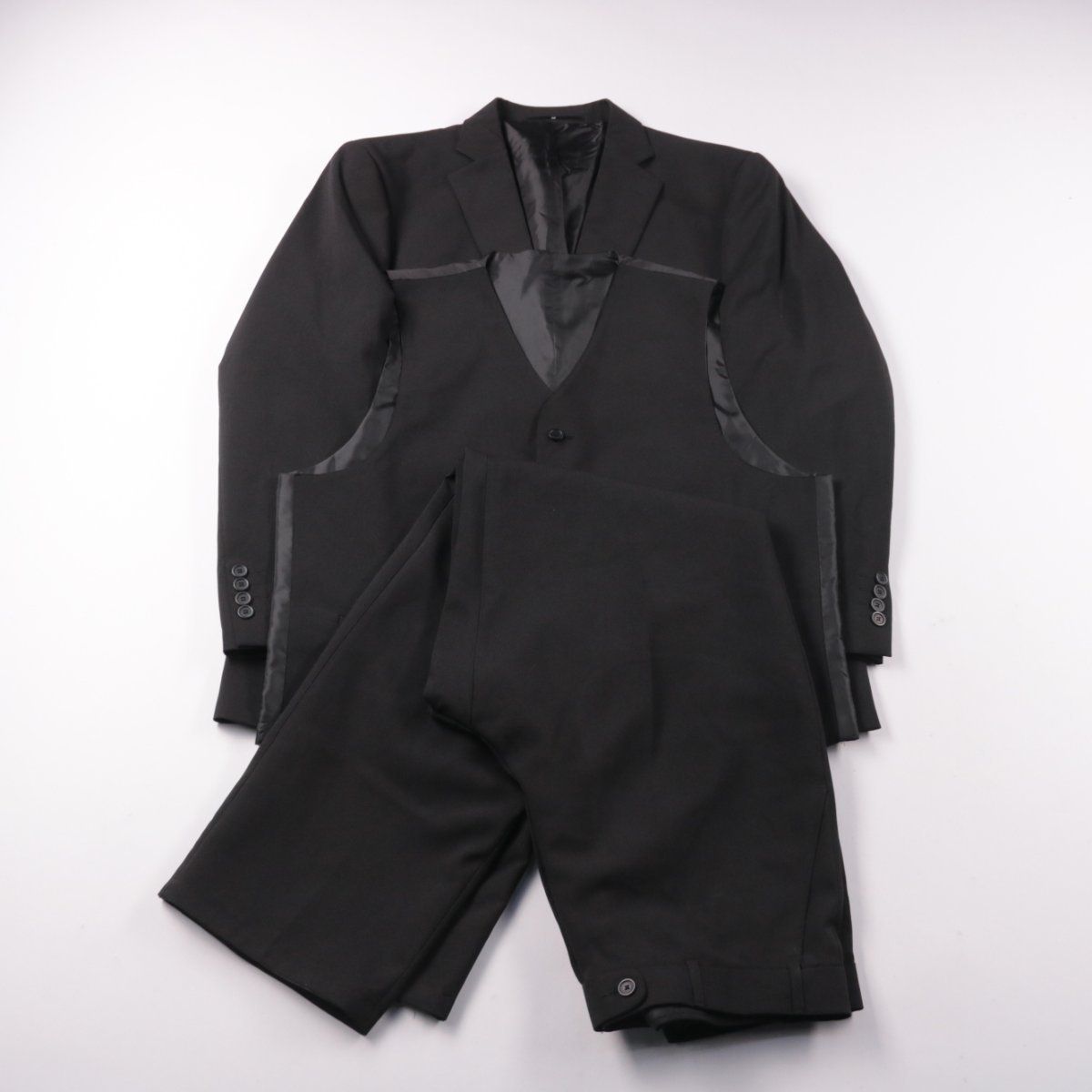 Мужской классический костюм-тройка: пиджак, жилет и брюки в чёрном цвете. Подойдёт для офиса, торжеств и официальных мероприятий благодаря строгому силуэту и лаконичному крою. Практичный вариант: все элементы комплекта можно носить отдельно и сочетать с базовыми рубашками.
