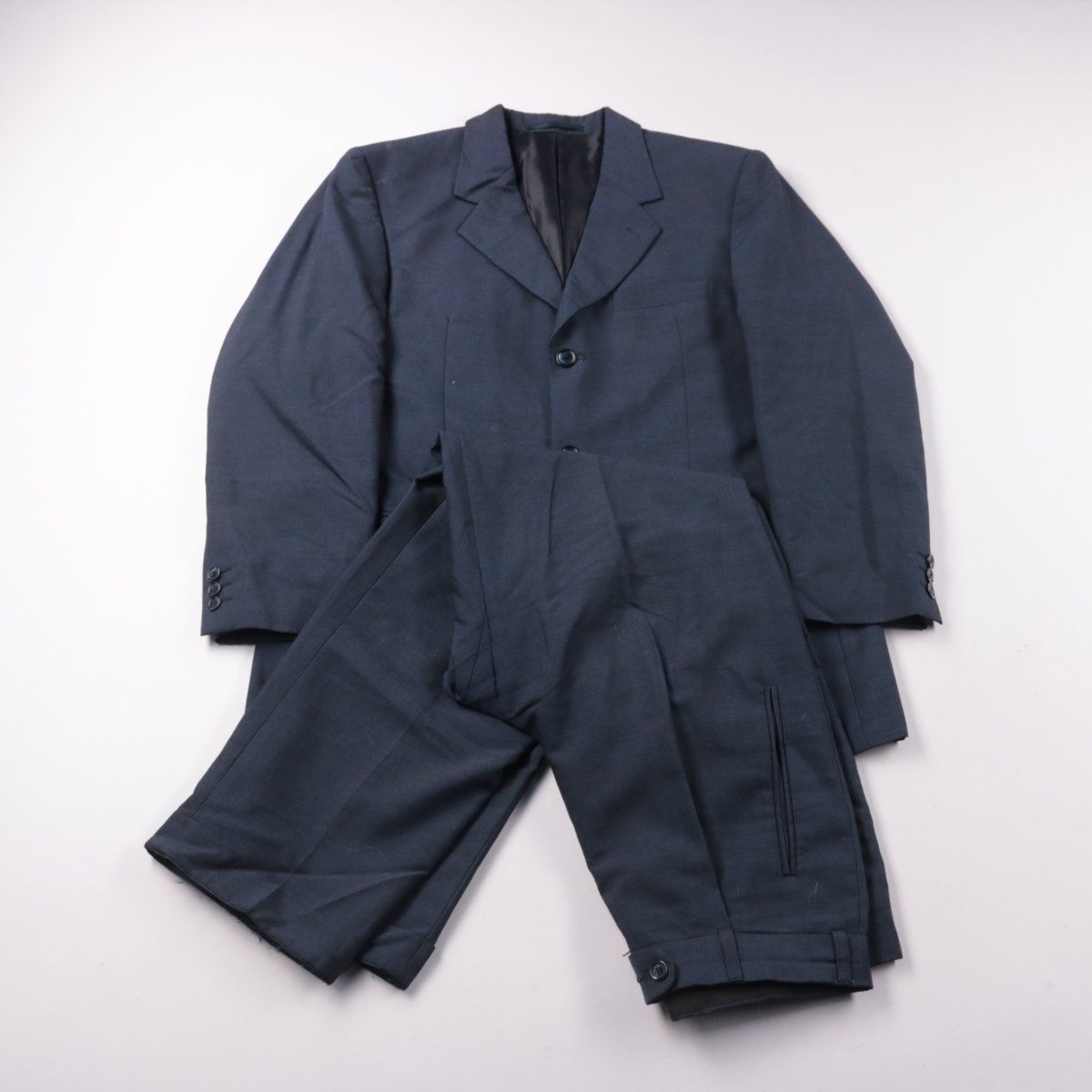 Мужской классический костюм тёмно-синего цвета: однобортный пиджак на 3 пуговицах и прямые брюки. Подойдёт для офиса, деловых встреч и торжественных мероприятий. Практичный тёмный оттенок легко сочетать с рубашками и обувью, а синтетический состав меньше мнётся и проще в уходе.
