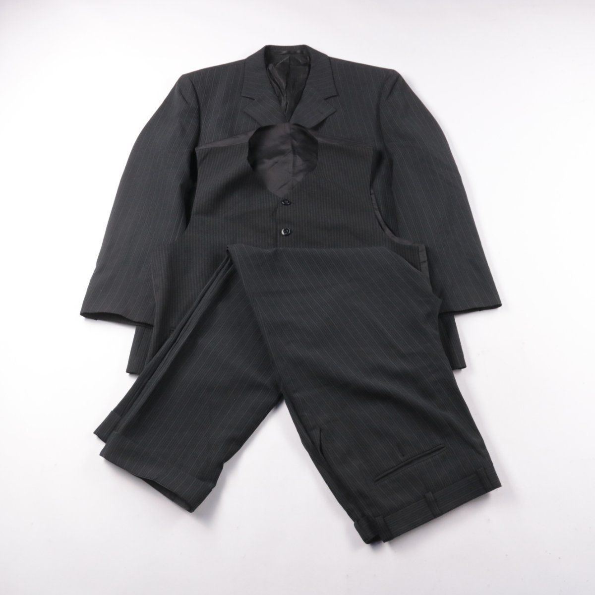 Мужской классический костюм Angelo Litrico тёмно-серого цвета в тонкую полоску (пиджак, жилет и брюки). Подойдёт для офиса и торжественных случаев. Смесовая ткань на основе полиэстера практична в носке и проще в уходе.