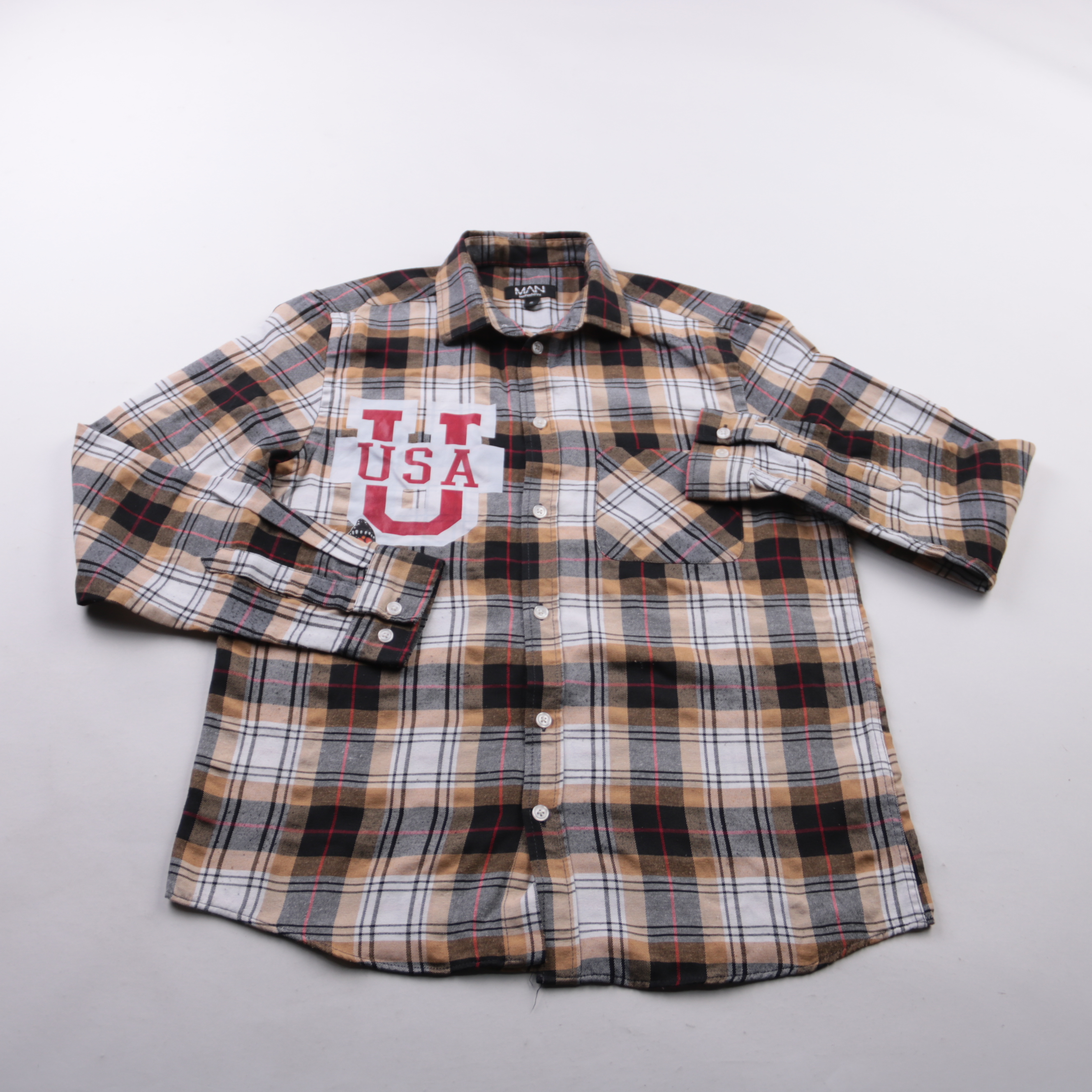 Мужская рубашка BoohooMAN в клетку с крупной нашивкой USA U на груди и застёжкой на пуговицы. Подойдёт для повседневной носки в городе и для образов в стиле casual в прохладную погоду. Плотная фланелевая ткань приятна к телу и хорошо держит форму.