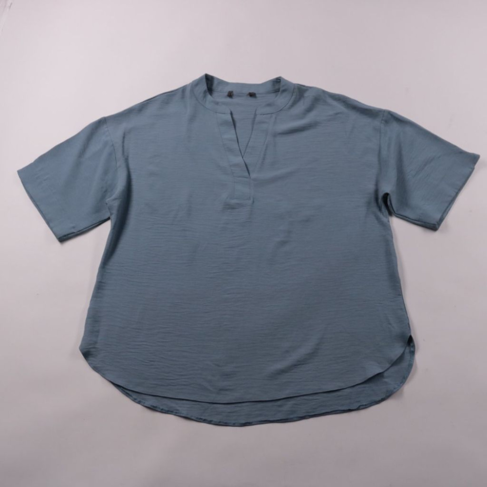 Лёгкая рубашка без бренда в пыльно-голубом цвете, с коротким рукавом и воротом без отложного воротника. Подойдёт для тёплой погоды и повседневных образов с шортами или брюками. Ткань тонкая и дышащая, удобно носить в жару.