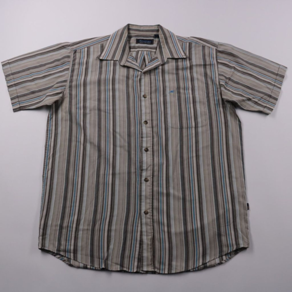 Мужская рубашка Meantime в полоску, с коротким рукавом и застёжкой на пуговицы. Подойдёт для повседневных образов и отпуска в тёплую погоду. Практичный вариант: лёгкая и хорошо сочетается с джинсами или шортами.