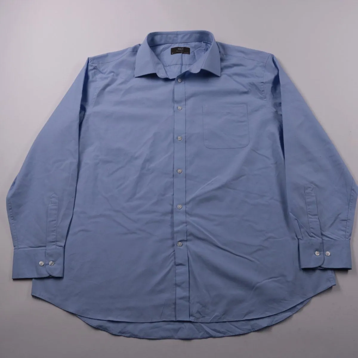 Мужская рубашка M&S Regular Fit голубого цвета с длинным рукавом и нагрудным карманом. Подойдёт для офиса и повседневных образов, хорошо смотрится как под пиджак, так и с джинсами. Практичный плюс — хлопковая ткань приятна к телу и дышит.