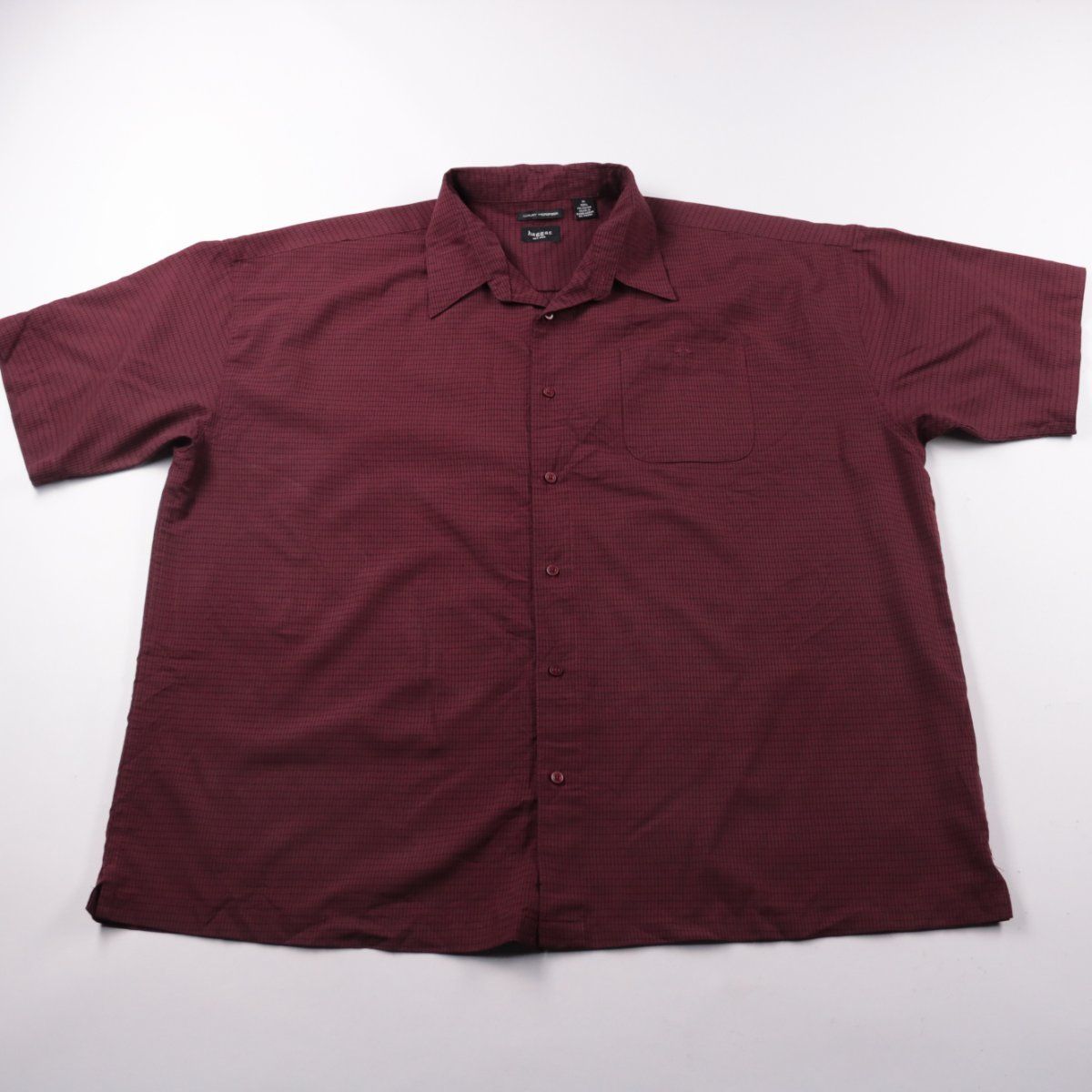 Мужская рубашка Haggar из микрофибры в бордовом цвете, с коротким рукавом и нагрудным карманом. Подойдёт для офиса, повседневной носки и поездок — аккуратно смотрится и легко сочетается с брюками или джинсами. Практичный плюс: ткань из полиэстера быстро сохнет и почти не мнётся.