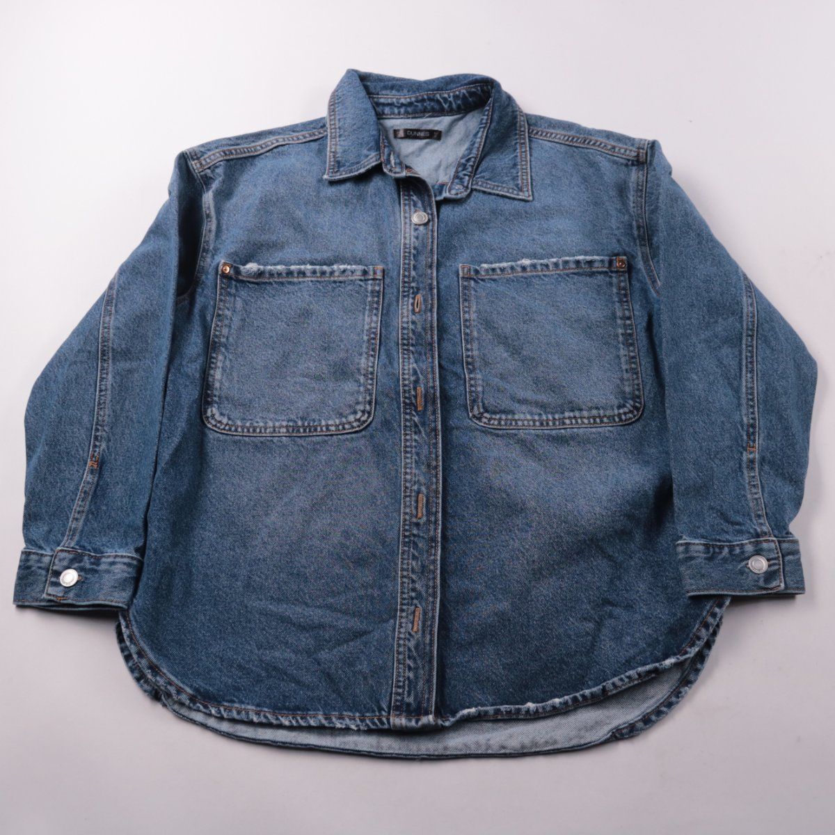 Джинсовая рубашка Dunnes Stores из плотного хлопкового денима, застёжка на пуговицах и два нагрудных кармана. Подойдёт для повседневной носки и как верхний слой в прохладную погоду. Практичный материал хорошо держит форму и легко сочетается с базовыми вещами.