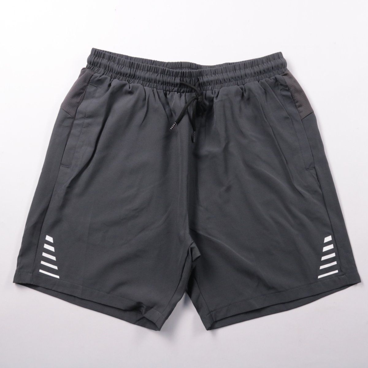 Мужские спортивные шорты, лёгкие и удобные для тренировок и прогулок в тёплую погоду. Модель с эластичным поясом на шнурке и карманами, есть светоотражающие элементы по низу. Практичны тем, что быстро сохнут и не сковывают движения.