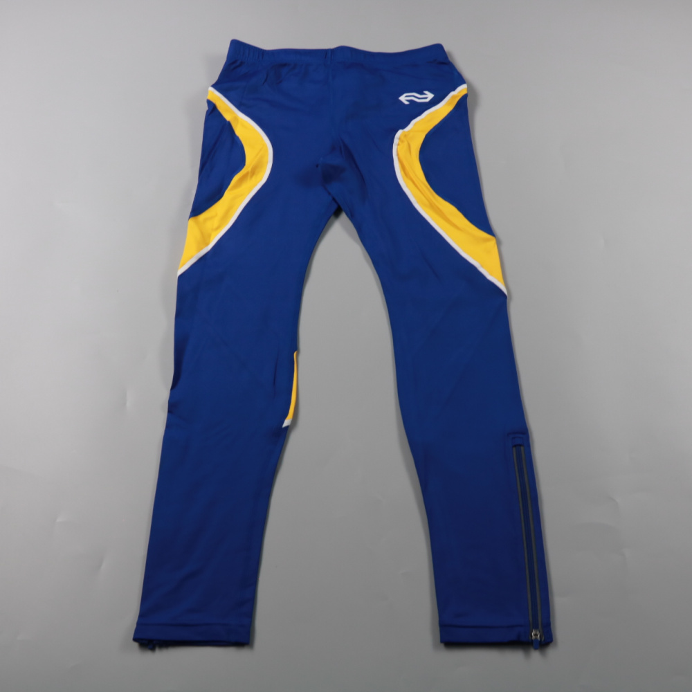 Мужские спортивные леггинсы Newline синего цвета с жёлтыми вставками и молниями снизу штанин. Подойдут для бега и тренировок в зале, хорошо тянутся и плотно сидят по фигуре. Практичны тем, что быстро сохнут и удобно надеваются/снимаются благодаря молниям.