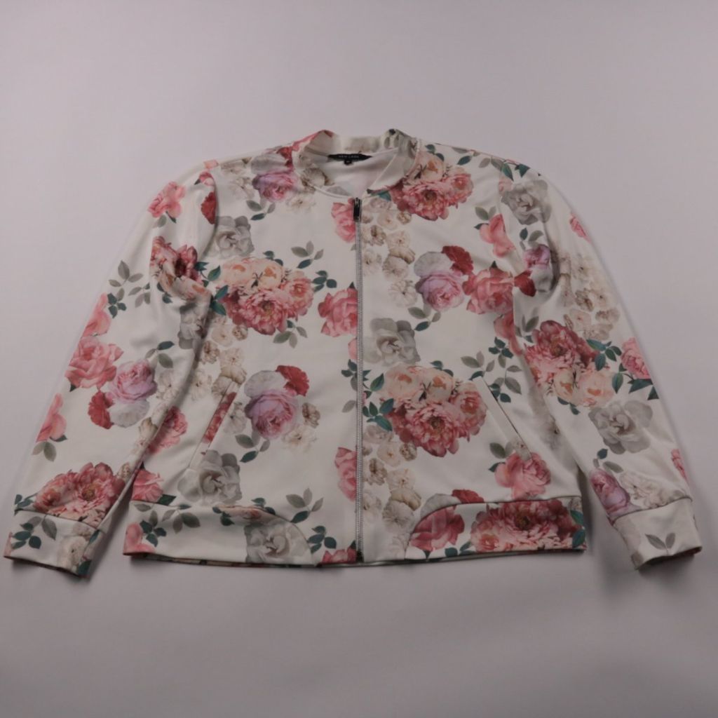 Лёгкая женская куртка New Look на молнии с цветочным принтом и боковыми карманами. Подойдёт для тёплой весны/осени и прохладных летних вечеров, хорошо смотрится с джинсами и однотонными платьями. Практичный плюс — эластичная ткань (полиэстер с эластано...