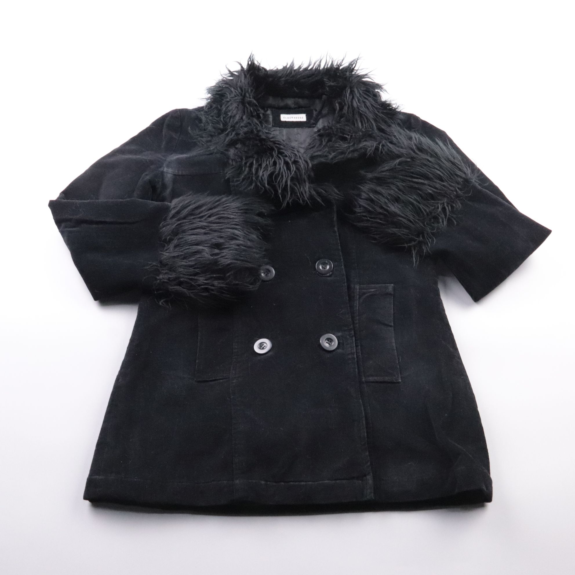 Женское чёрное пальто Clockhouse прямого кроя с двубортной застёжкой и отделкой под мех на воротнике и манжетах. Подойдёт для зимних прогулок и повседневных образов в городе. Практичное преимущество — тёплый воротник и плотная ткань лучше защищают от в...