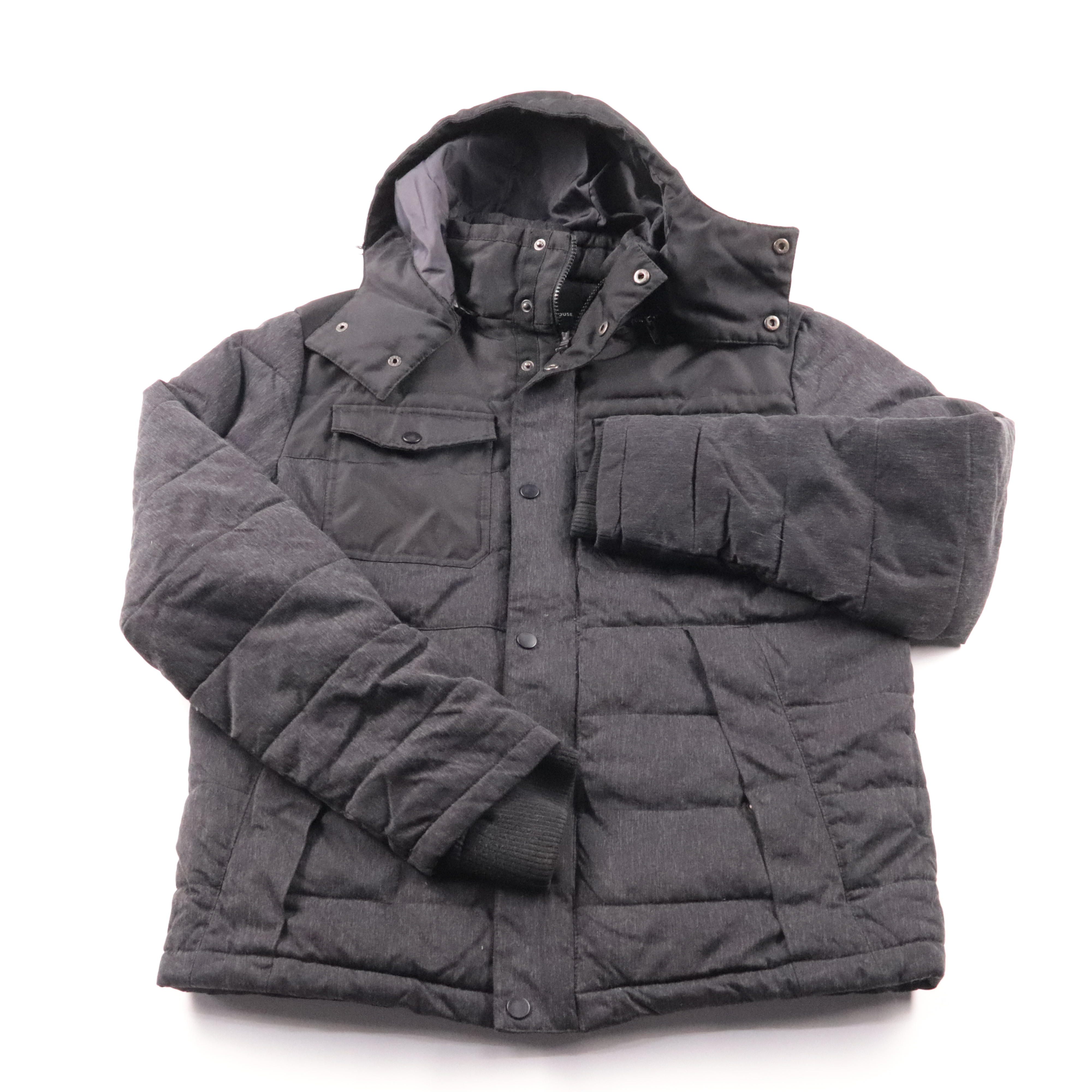 Мужская зимняя куртка Clockhouse тёмно-серого цвета с капюшоном и стёганым утеплителем. Подойдёт для повседневной носки в холодную погоду благодаря высоким воротнику и манжетам-резинкам. Практичный плюс — застёжка на молнию с ветрозащитной планкой и ка...