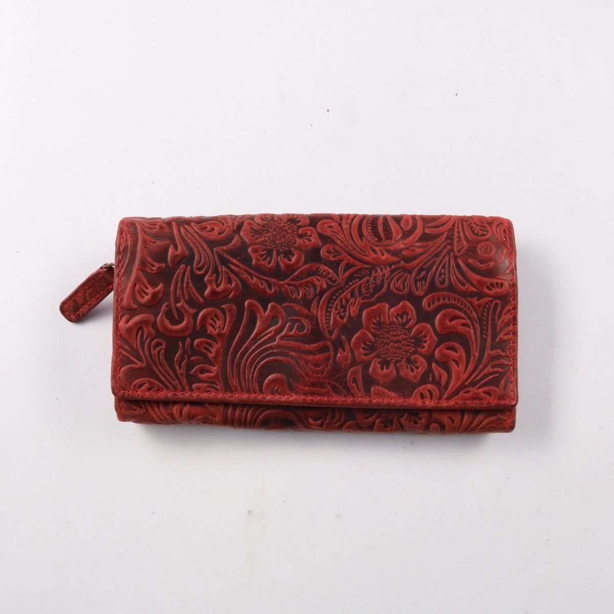 Кошелёк из тиснёного материала красного цвета с клапаном и дополнительным отделением на молнии снаружи. Внутри есть несколько отделений для купюр, карманы для карт и прозрачное окно для документа — подойдёт для повседневного использования и поездок. Практично тем, что мелочь и мелкие вещи можно хранить в отдельном кармане на молнии.