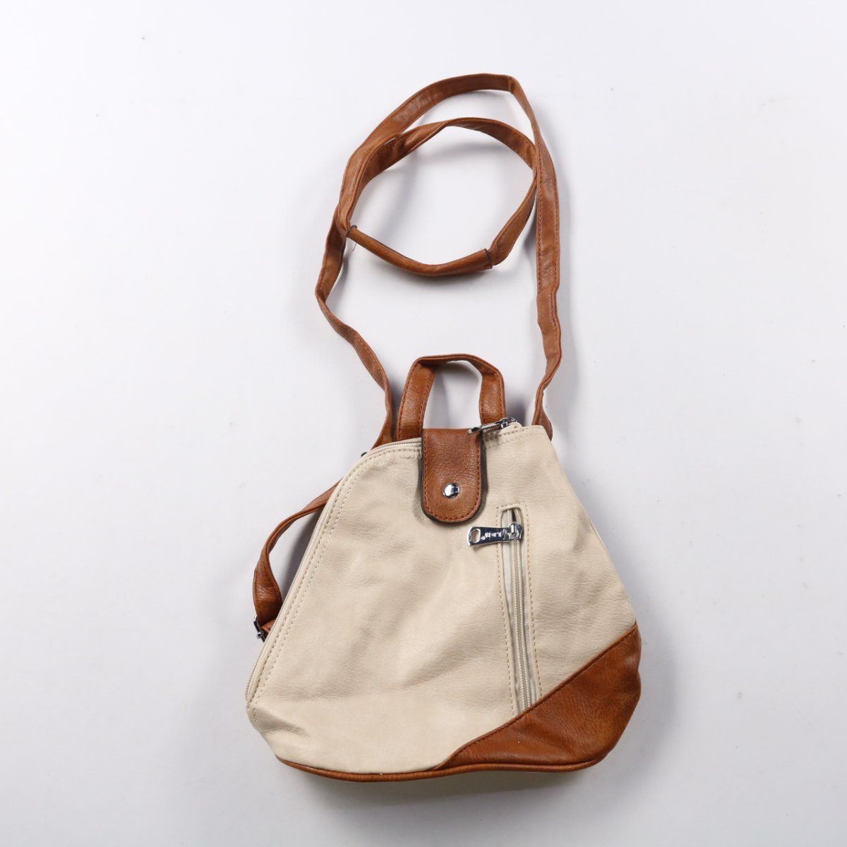 Небольшой рюкзак без указанного бренда, выполнен в бежевом цвете с коричневыми вставками и внешним карманом на молнии. Подойдёт для повседневных прогулок и города, когда нужно взять только самое необходимое. Регулируемые лямки позволяют носить удобно, внутри есть отделение с карманом на молнии.
