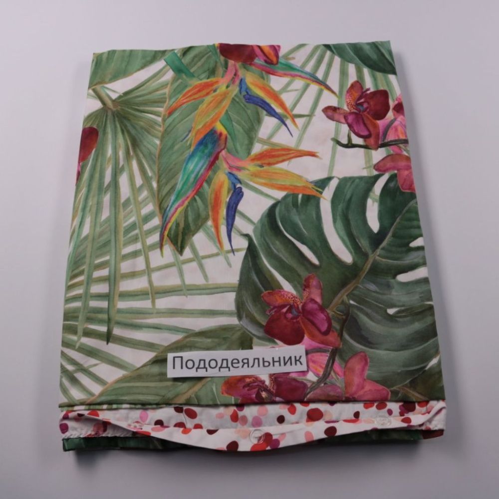 Пододеяльник с ярким тропическим принтом: крупные листья и цветы, двухсторонний — с одной стороны рисунок, с другой мелкий узор. Подойдёт для спальни или дачи, когда хочется добавить цвета в интерьер. Практичен тем, что легко освежает вид постели и мож...