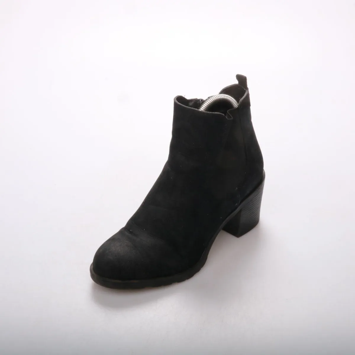 Женские ботильоны из чёрной замши на устойчивом каблуке. Подойдут на каждый день в демисезон: к джинсам, платьям и юбкам, удобны для города. Практичное преимущество — боковая молния, за счёт которой обувь легко надевать и снимать.