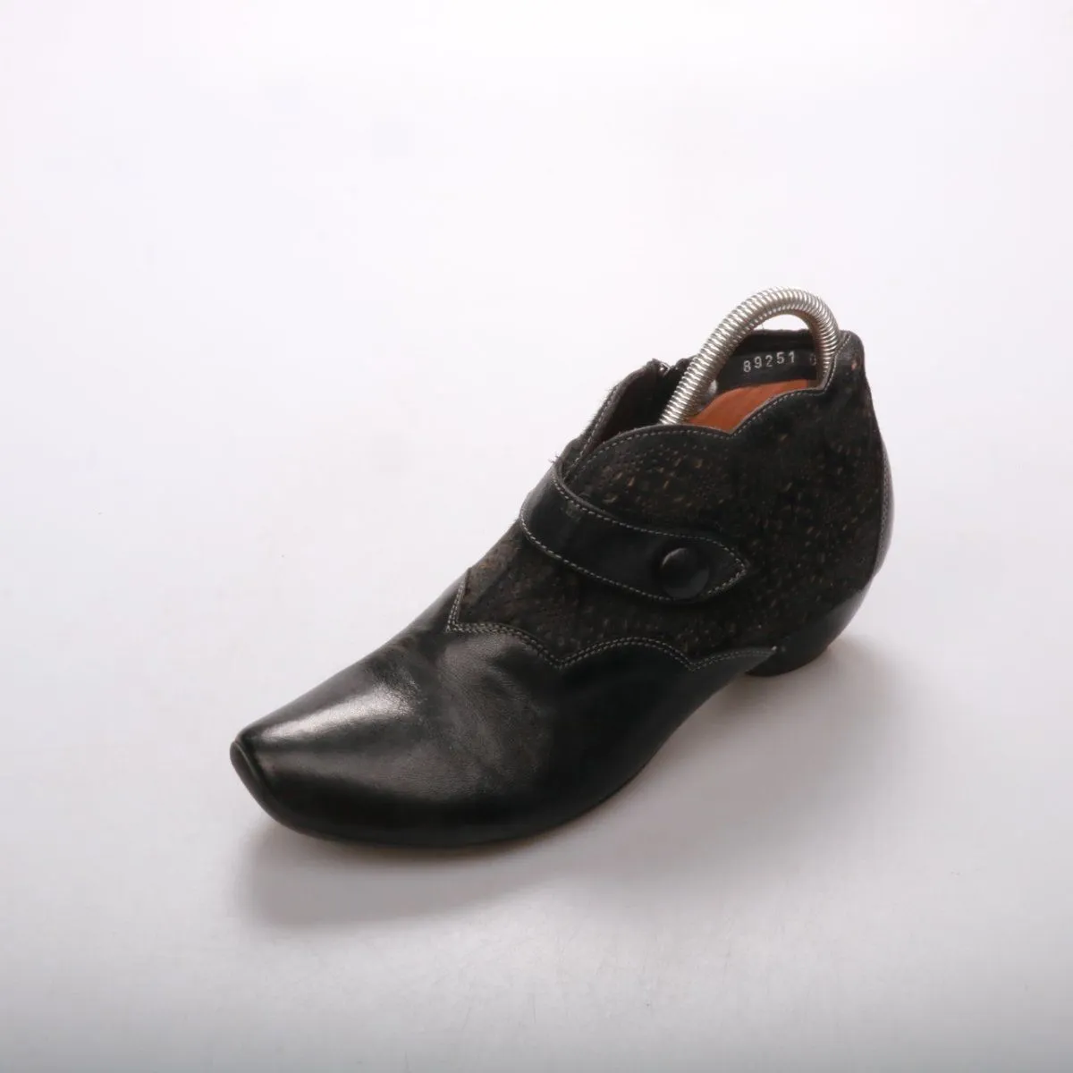 Женские ботильоны Maretto из натуральной кожи, чёрного цвета, с ремешком на кнопке и боковой молнией. Подойдут для повседневных городских образов в демисезон и прохладное лето. Практичный плюс — устойчивый невысокий каблук и удобная посадка за счёт молнии.