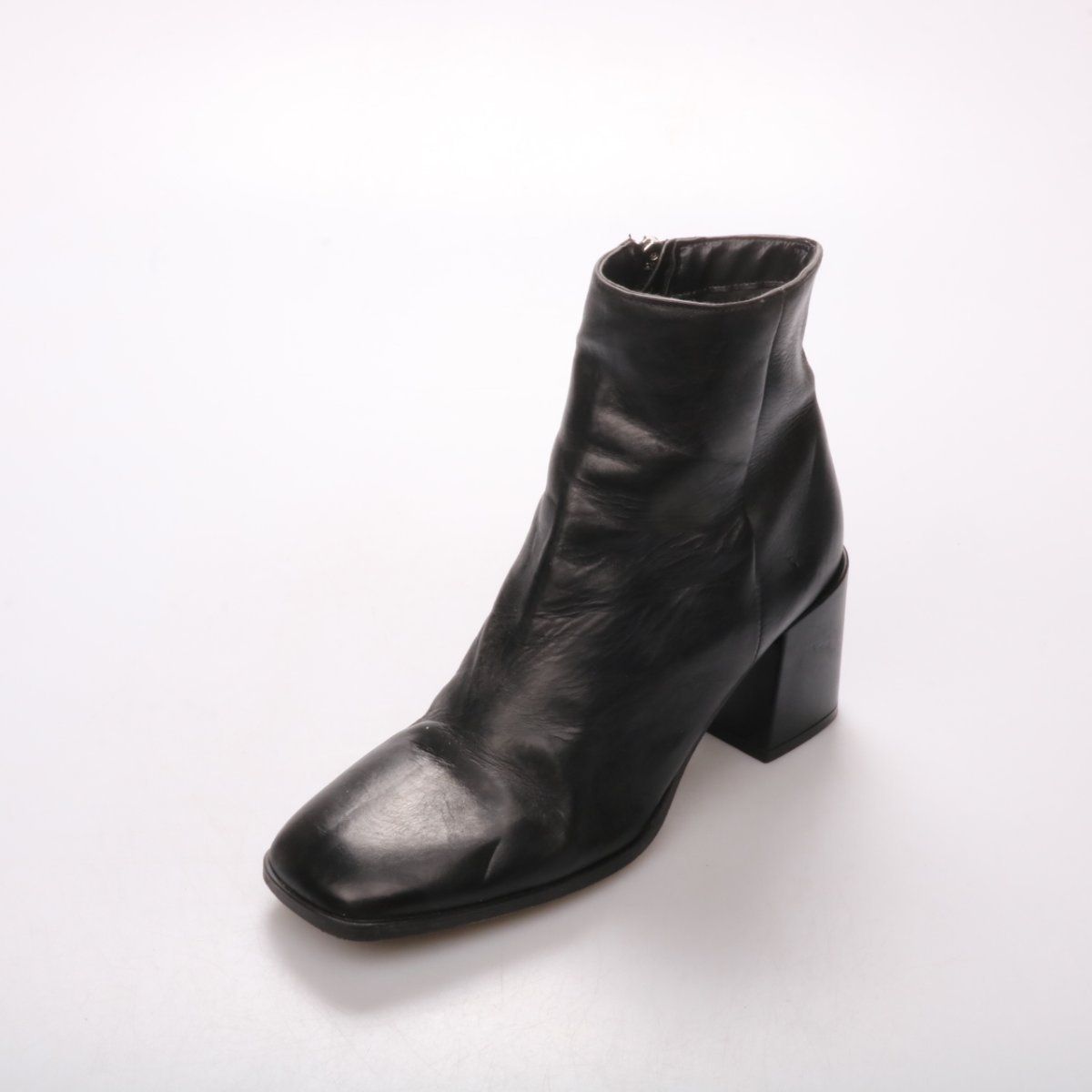 Женские ботильоны из чёрной натуральной кожи на устойчивом каблуке и с квадратным носком. Удобны для повседневных образов в межсезонье, хорошо смотрятся с джинсами и юбками. Практичная молния сбоку облегчает надевание и посадку по щиколотке.