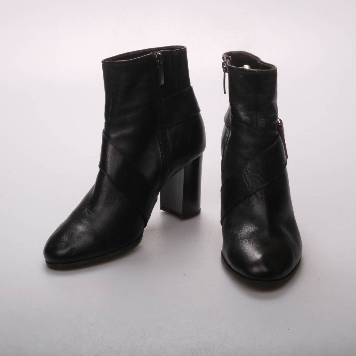 Женские кожаные ботильоны Tamaris чёрного цвета на устойчивом высоком каблуке, с боковой молнией. Подойдут для повседневных городских образов в прохладную погоду (осень/весна). Каблук-столбик даёт более уверенную опору при ходьбе.