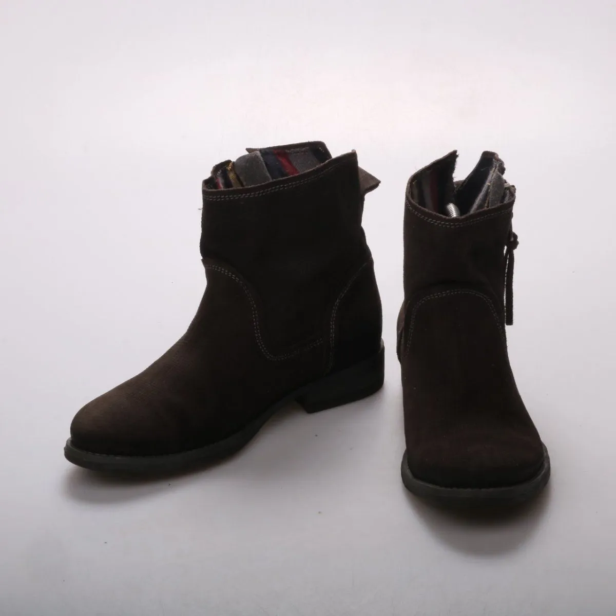 Женские ботильоны без бренда из тёмной замши с боковой молнией и небольшим устойчивым каблуком. Подойдут для повседневной носки в межсезонье, хорошо сочетаются с джинсами и платьями. Молния облегчает надевание и посадку по щиколотке.
