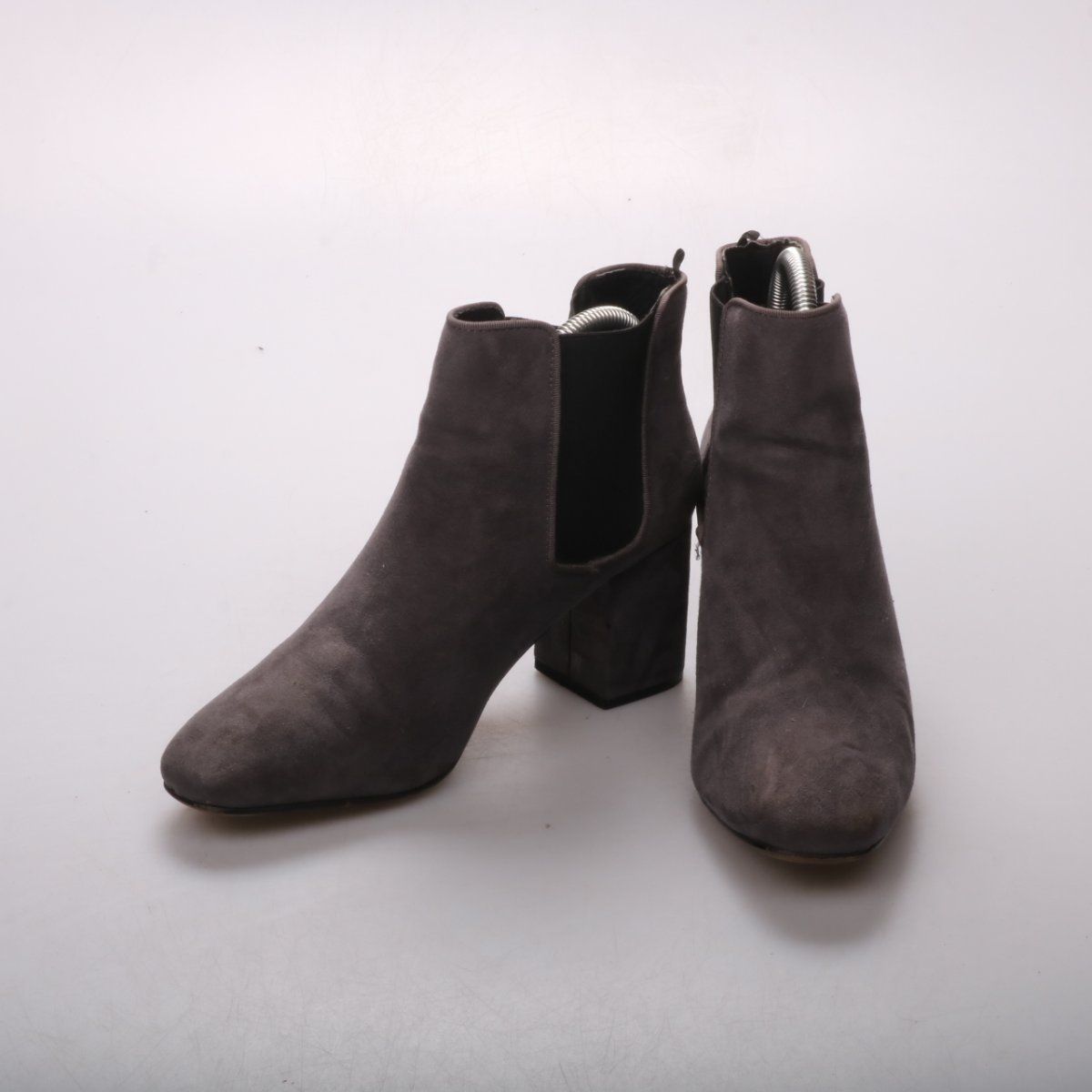 Ботильоны H&M из серого материала под замшу на устойчивом каблуке-столбике. Боковые эластичные вставки и вырез облегчают надевание, модель подойдёт для повседневных городских образов в прохладную погоду. Практичный плюс — стабильный каблук удобнее для длительной ходьбы.