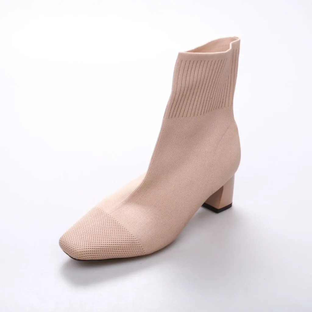 Трикотажные ботильоны-носок в бежевом цвете на устойчивом каблуке. Подойдут для повседневных образов в межсезонье и на выход. Эластичное голенище плотно сидит по ноге и удобно надевается без застёжек.