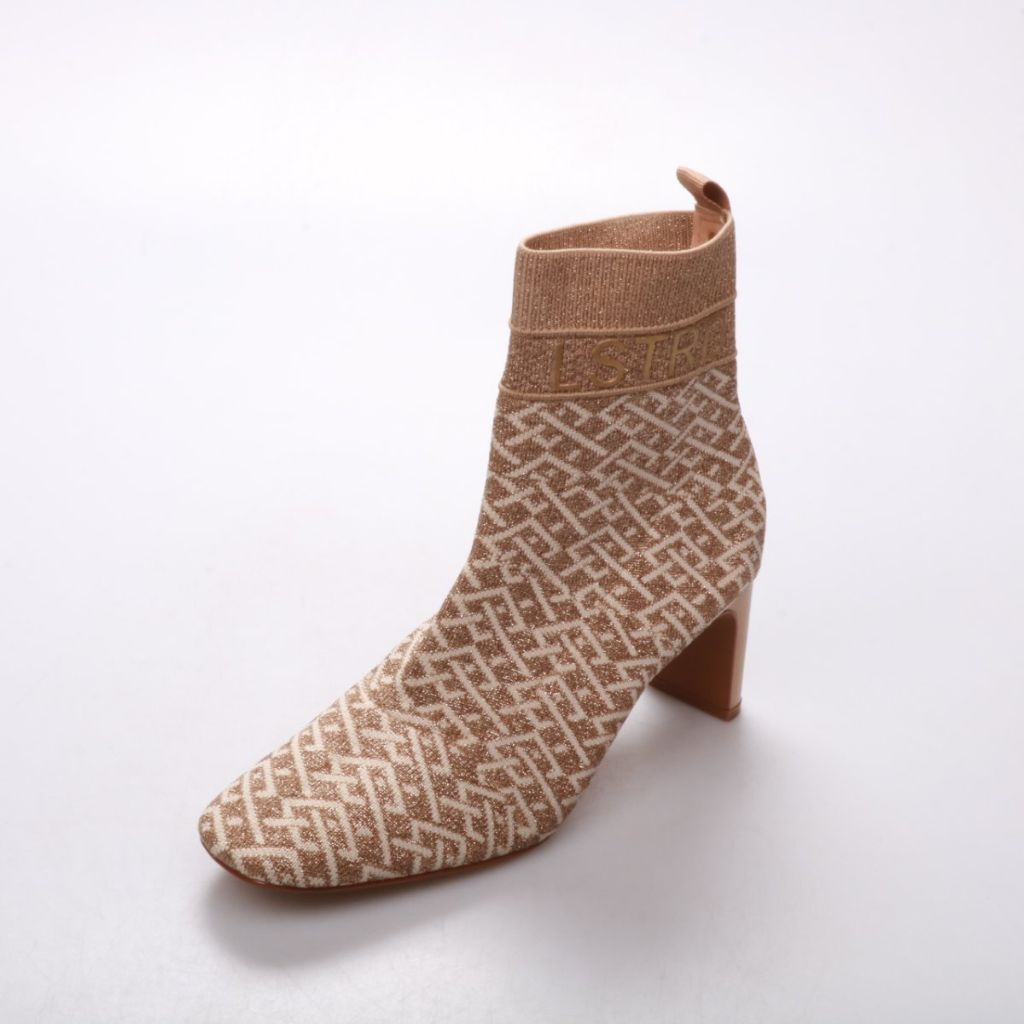 Женские ботильоны-«носок» из трикотажа с бежево-коричневым узором и эластичным верхом. Подойдут для демисезонной погоды и повседневных образов с брюками или юбками. Устойчивый каблук и облегающий голенище дают комфортную посадку и их легко надевать.