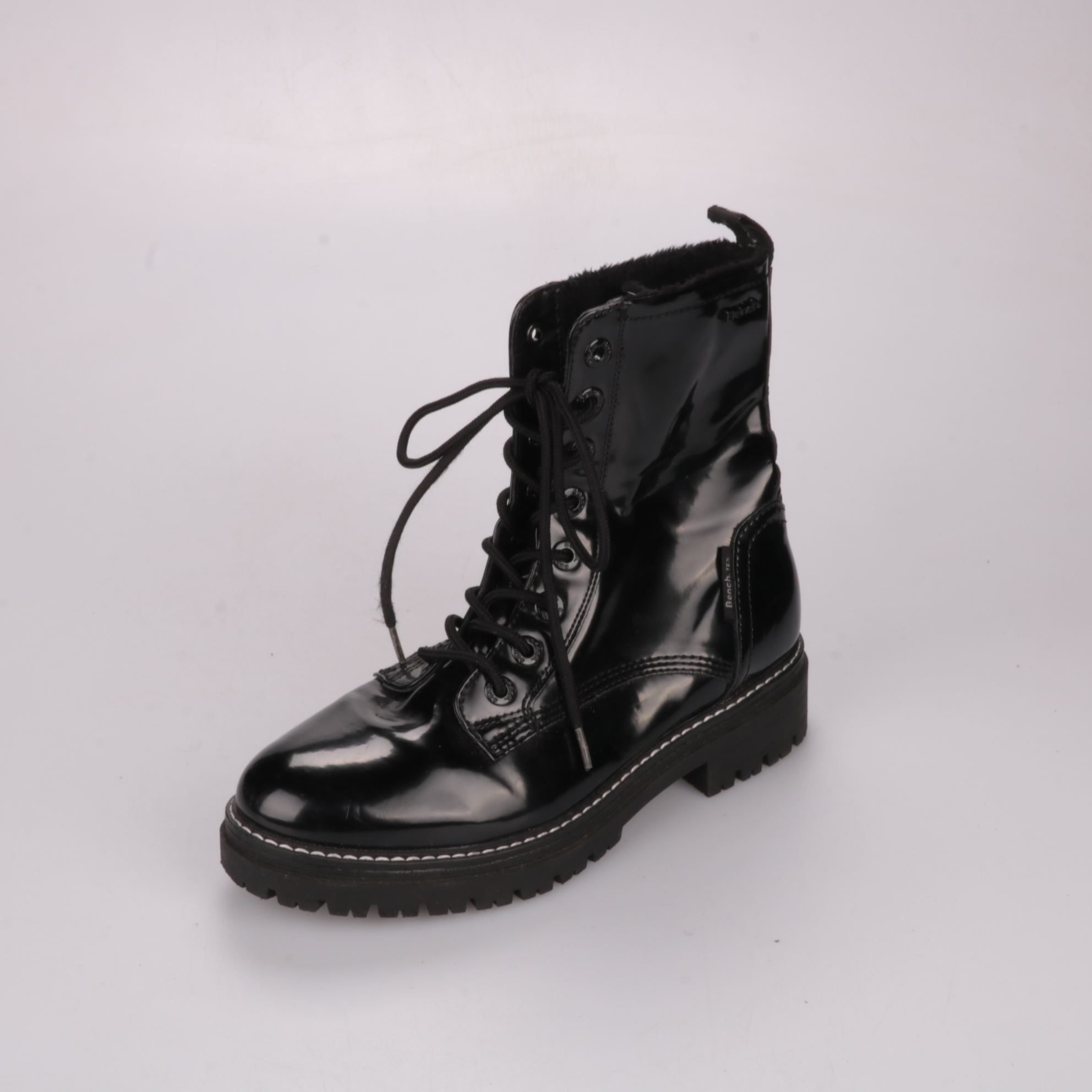 Женские ботинки Bench в черном глянцевом исполнении на шнуровке и с массивной тракторной подошвой. Подойдут на каждый день в демисезон, хорошо смотрятся с джинсами и платьями в стиле casual/grunge. Рельефная подошва дает устойчивость и хорошее сцеплени...