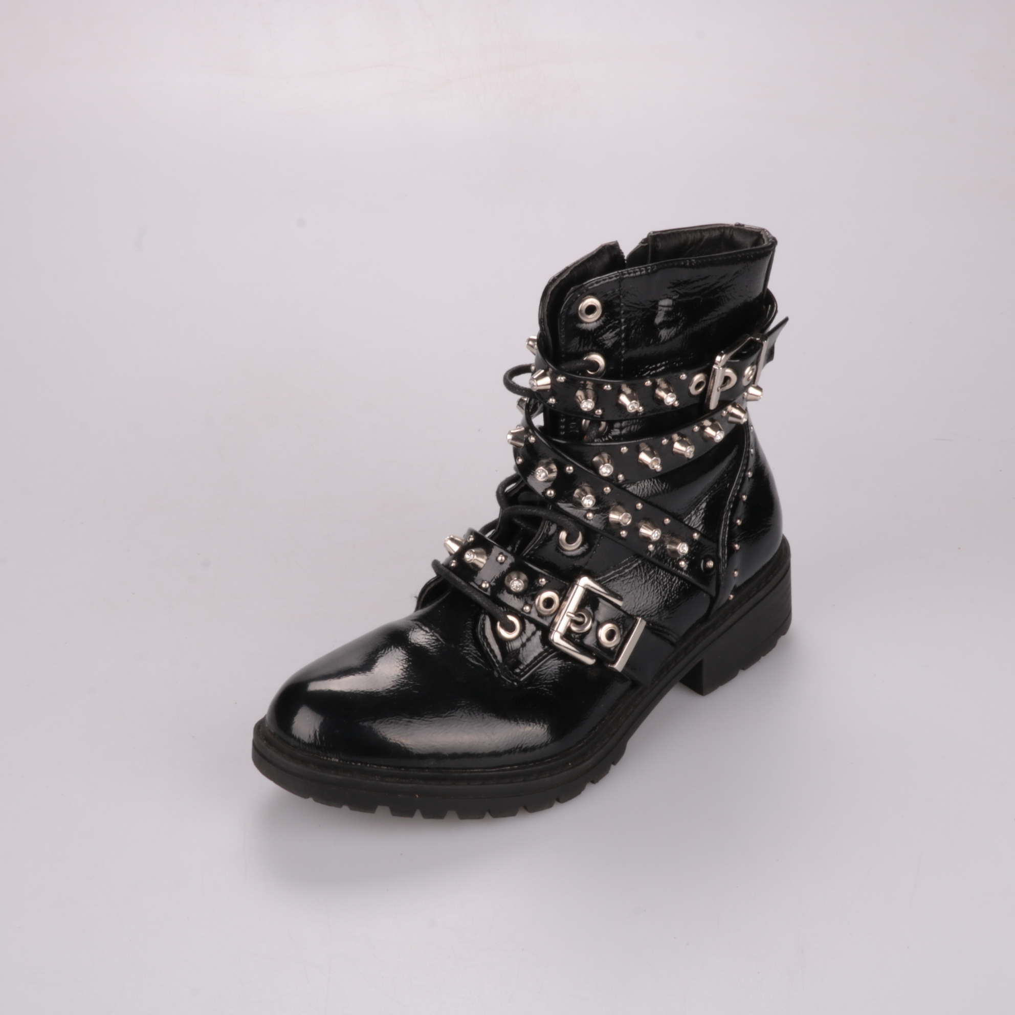 Лаковые ботинки с ремешками, заклёпками и пряжками, удобная шнуровка и боковая молния для быстрого надевания. Подойдут для демисезона и повседневных образов в стиле casual/grunge. Рифлёная подошва даёт хорошее сцепление и устойчивость при ходьбе.