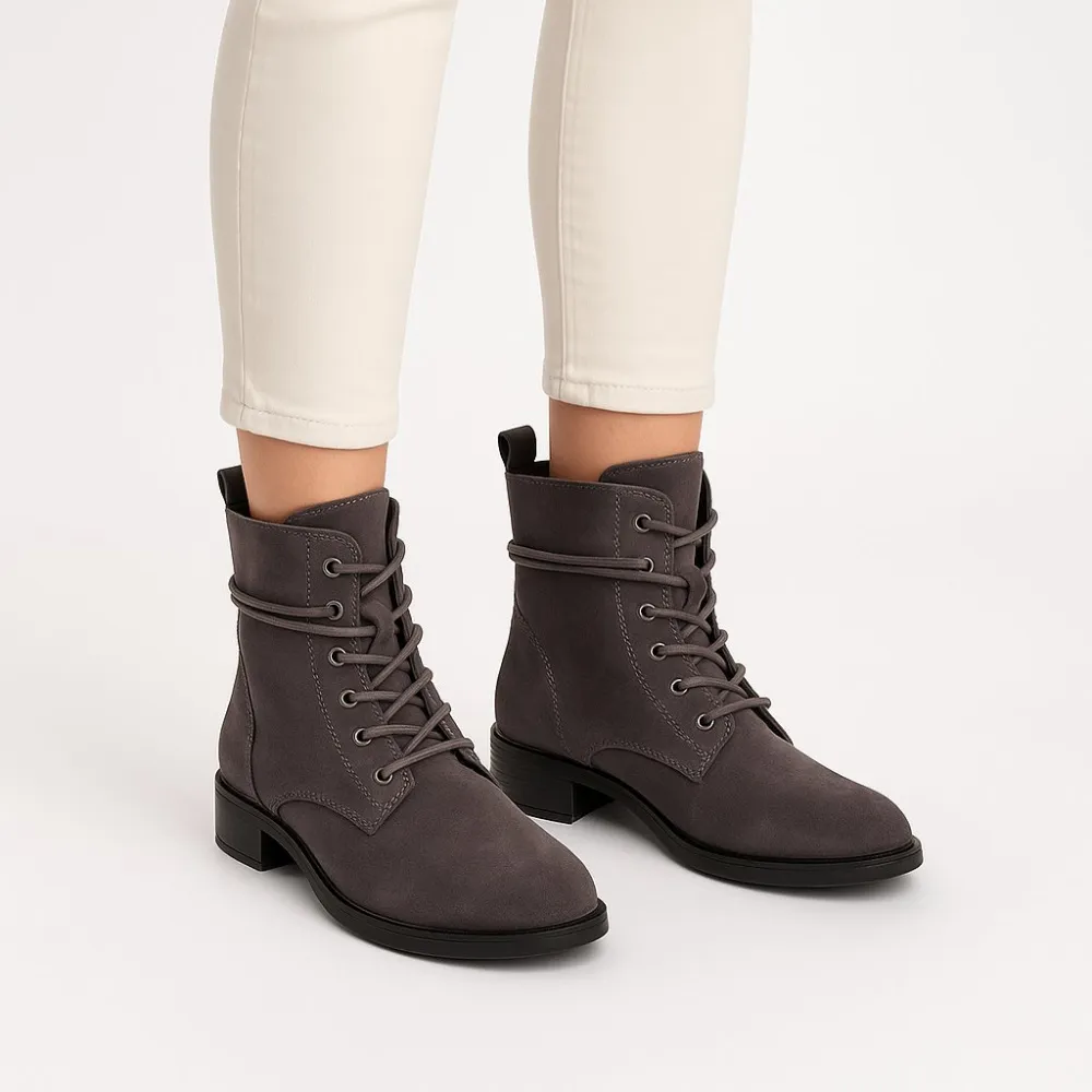 Женские демисезонные ботинки на шнуровке с боковой молнией, удобны для повседневной носки и прогулок. Спокойный серый цвет легко сочетается с джинсами и платьями, устойчивый низкий каблук делает шаг комфортнее.