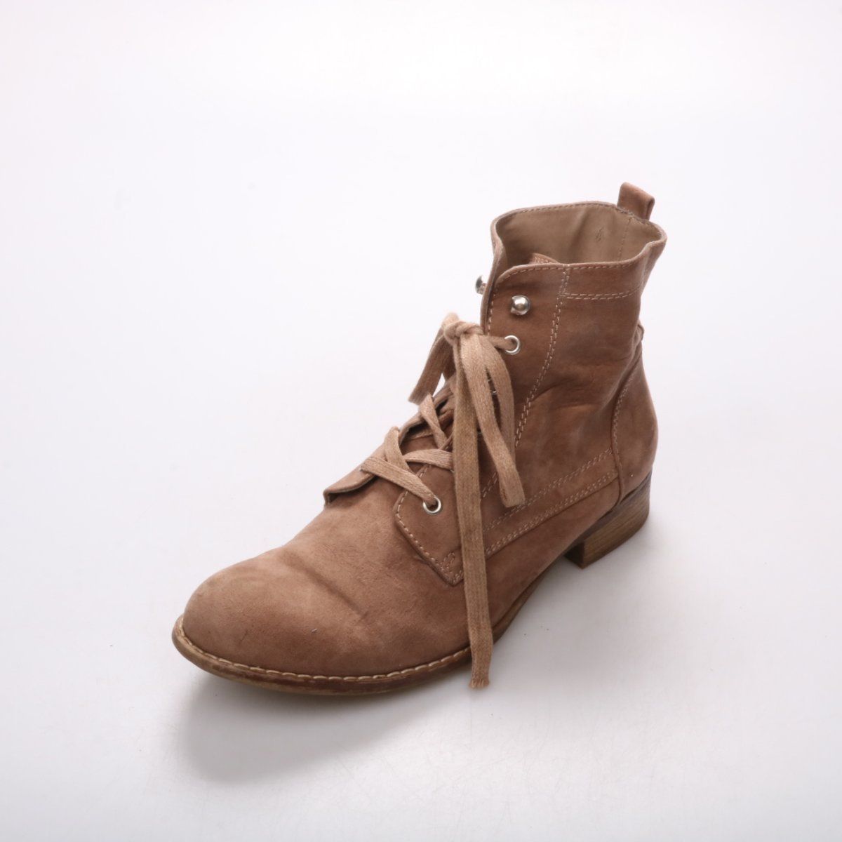 Женские ботинки Graceland из мягкой замши в бежево-коричневом оттенке, на шнуровке и небольшом устойчивом каблуке. Подойдут для повседневных образов в демисезон — с джинсами, платьями и пальто. Практичный плюс: удобная посадка за счёт шнуровки и нескользящая подошва.