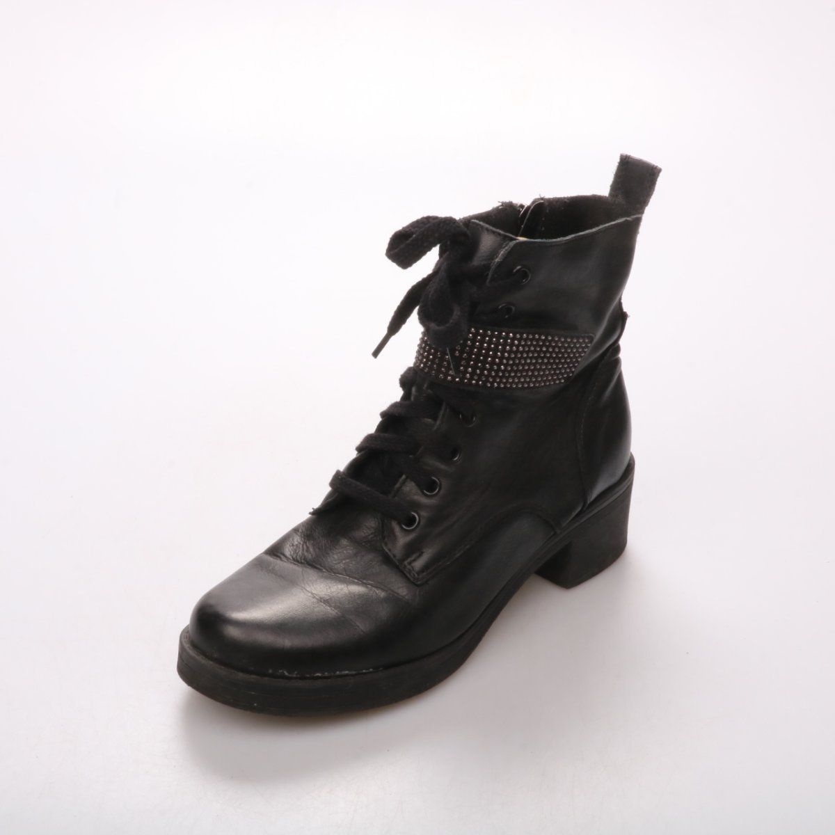 Женские демисезонные ботинки на шнуровке и с боковой молнией, выполнены в чёрном цвете с декоративной вставкой со стразами. Подойдут для повседневных образов с джинсами, брюками и юбками в прохладную погоду. Устойчивый каблук и плотная подошва делают пару удобной для длительной ходьбы.
