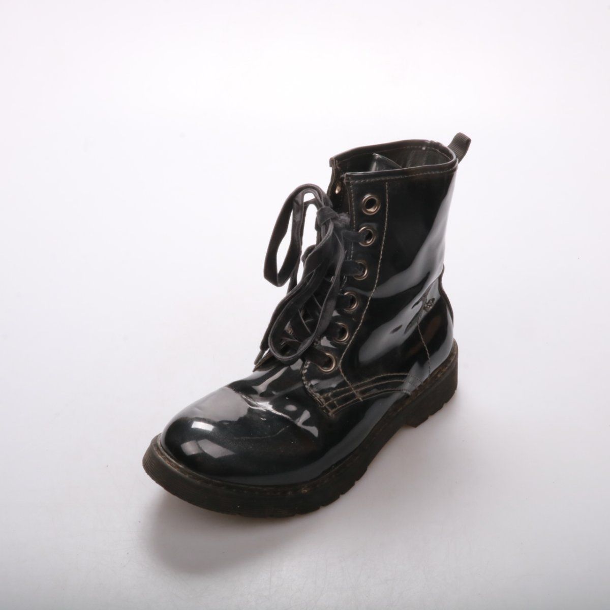 Лаковые ботинки на шнуровке в чёрном цвете, с круглым носком и рифлёной подошвой. Подойдут для повседневных образов в демисезон и прохладную погоду. Практичное преимущество — плотная подошва даёт хорошее сцепление на мокрой дороге.