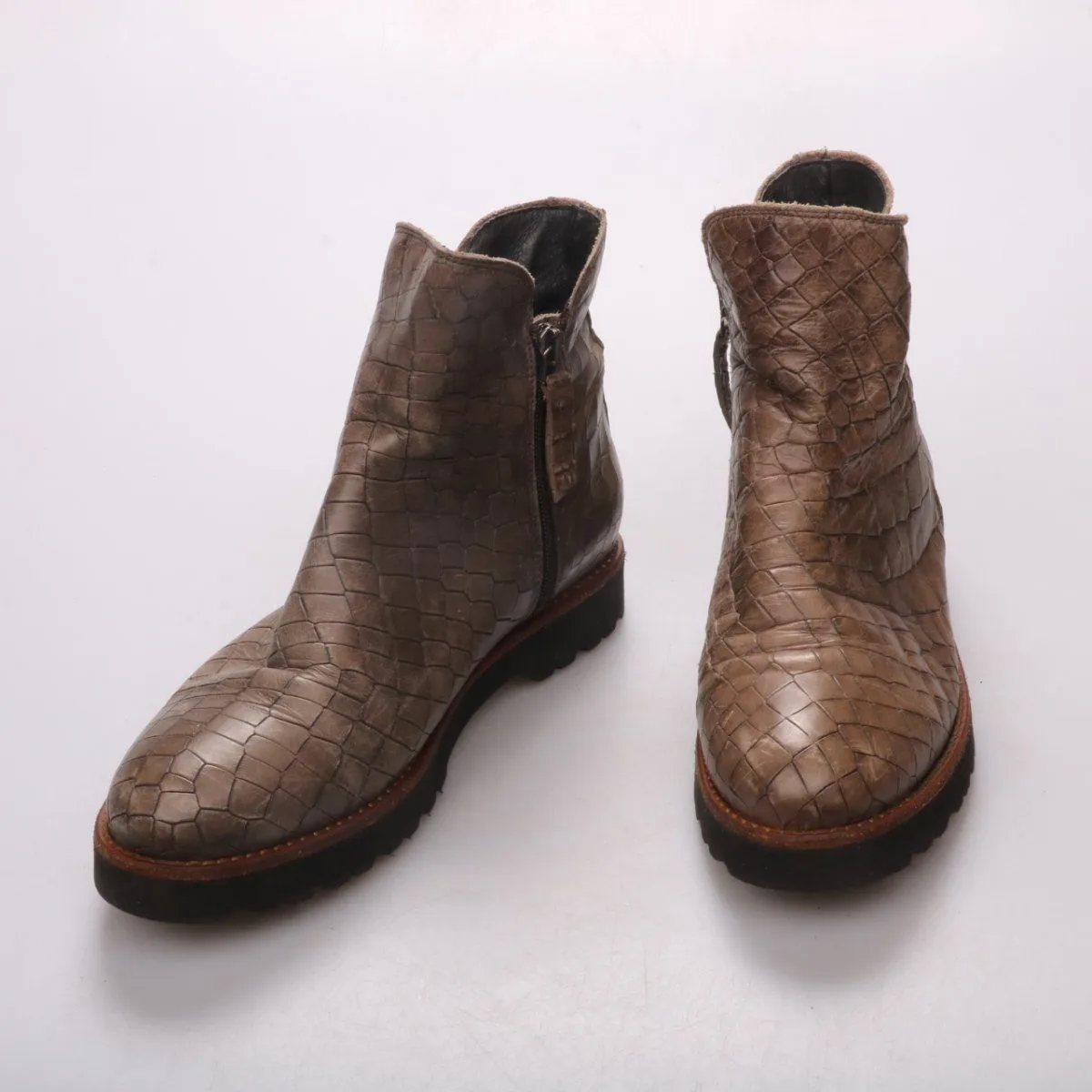 Женские ботинки aQa из натуральной кожи с тиснением под рептилию и боковой молнией. Подойдут для повседневной носки в демисезон, хорошо сочетаются с джинсами и брюками. Практичное преимущество — рельефная резиновая подошва с хорошим сцеплением.