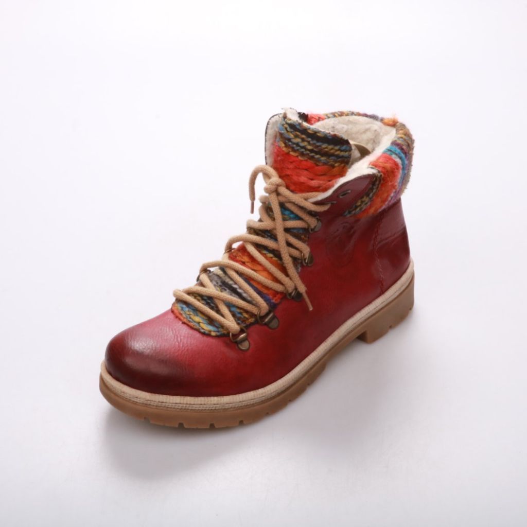 Женские ботинки Rieker из красной кожи с разноцветным текстильным кантом, шнуровкой и боковой молнией. Подойдут для города и прогулок в прохладную погоду осенью/весной благодаря утеплённой подкладке. Практичный плюс — рельефная подошва с хорошим сцепле...