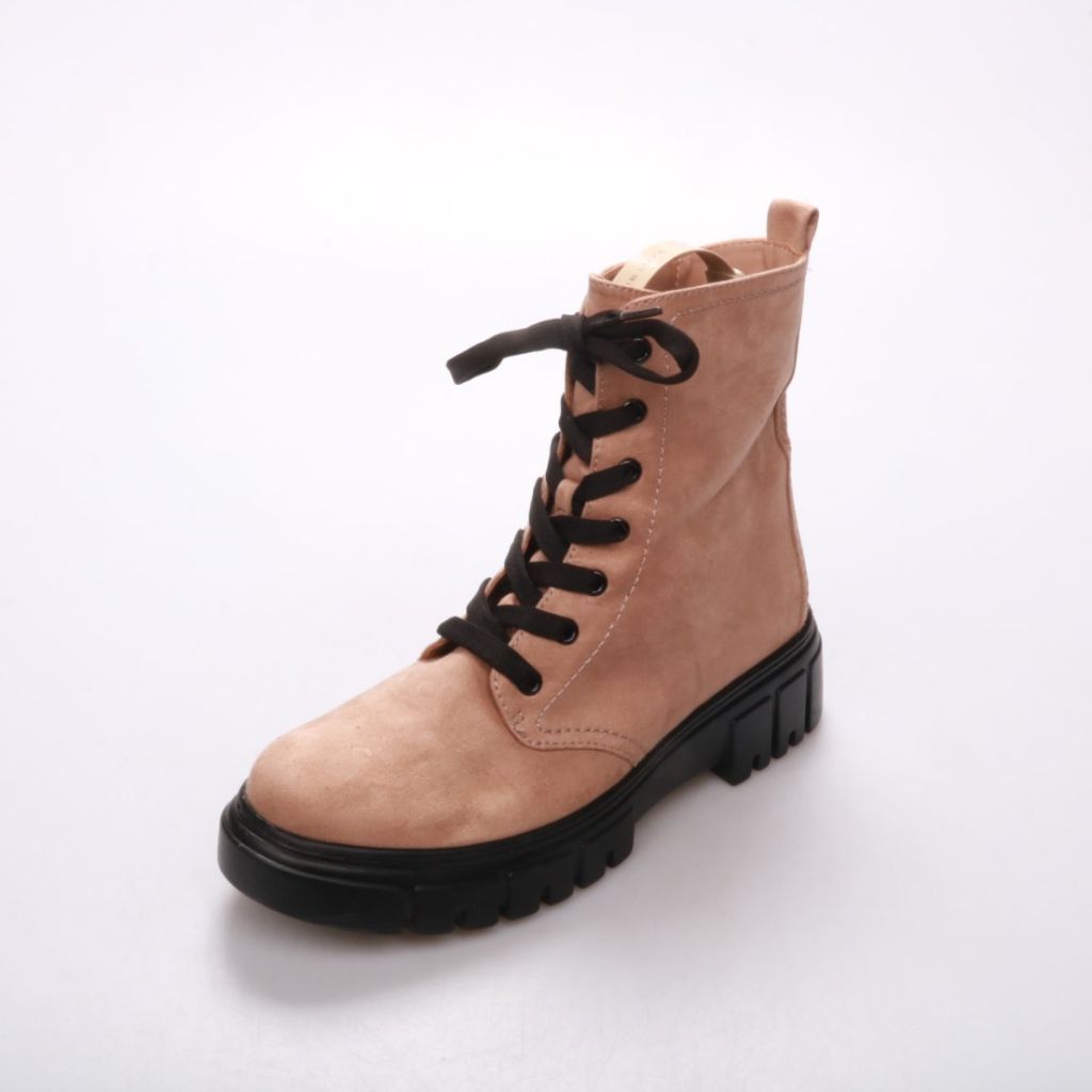 Женские ботинки на шнуровке с боковой молнией, без указания бренда. Подойдут на каждый день в демисезон благодаря плотной посадке и высокой шнуровке. Толстая рифлёная подошва даёт хорошее сцепление и устойчивость.