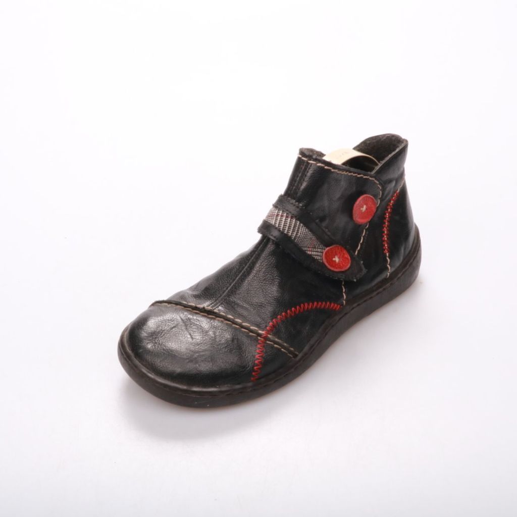 Женские ботинки Rieker из чёрной кожи с контрастной красной строчкой и застёжкой на липучке/молнии. Подойдут для повседневной носки в межсезонье и на прохладную погоду. Практичная подошва с выраженным протектором даёт устойчивость при ходьбе.