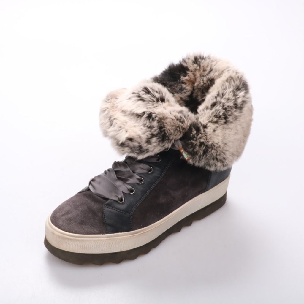 Зимние женские ботинки с отворотом из меха и шнуровкой на широких лентах. Верх комбинированный: замша и гладкая кожа, подошва с выраженным протектором для более устойчивой ходьбы. Подойдут для повседневной носки в холодную погоду, практичны за счёт нес...