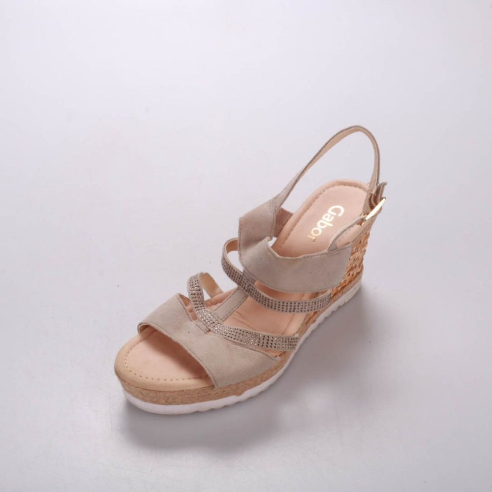 Женские сандалии Gabor на танкетке с плетёной отделкой и ремешками со стразами. Подойдут для летних прогулок и повседневных образов с платьями или шортами. Рифлёная подошва даёт хорошее сцепление и устойчивость.