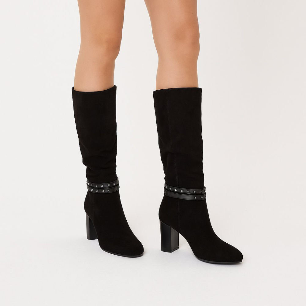 Женские чёрные сапоги средней высоты на устойчивом каблуке, с застёжкой-молнией сбоку и декоративным ремешком с заклёпками. Подойдут для повседневных образов в демисезон с платьями, юбками и джинсами. Устойчивый каблук удобен для ходьбы, а молния помог...