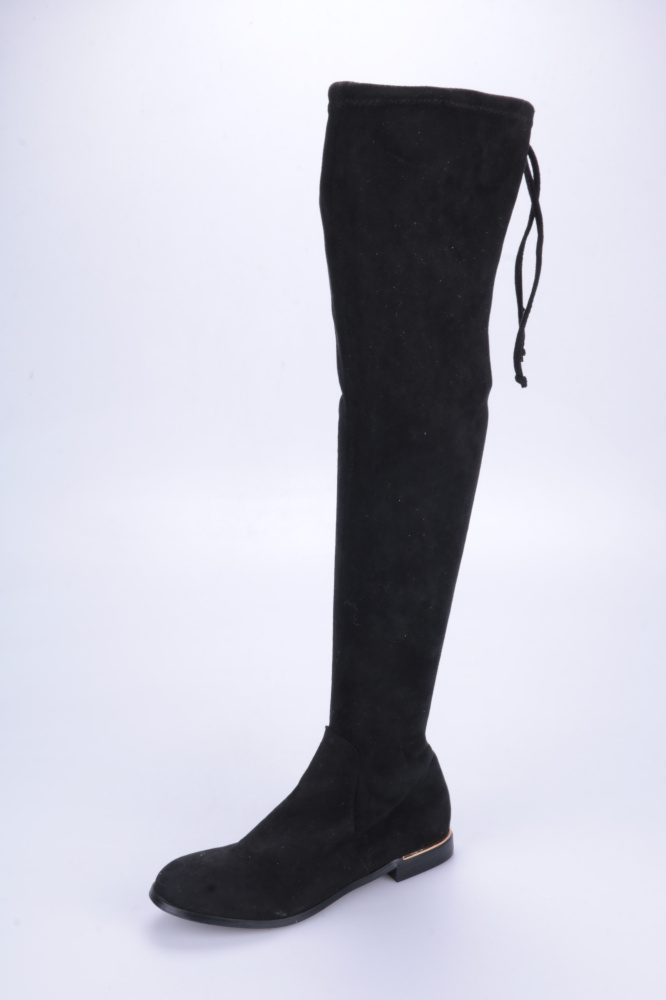 Женские сапоги-чулки выше колена из чёрного материала под замшу, на низком устойчивом каблуке. Сбоку есть молния, сверху шнуровка для регулировки посадки — удобно для осени и прохладной весны. Подошва плотная и нескользкая, подходит для повседневной но...