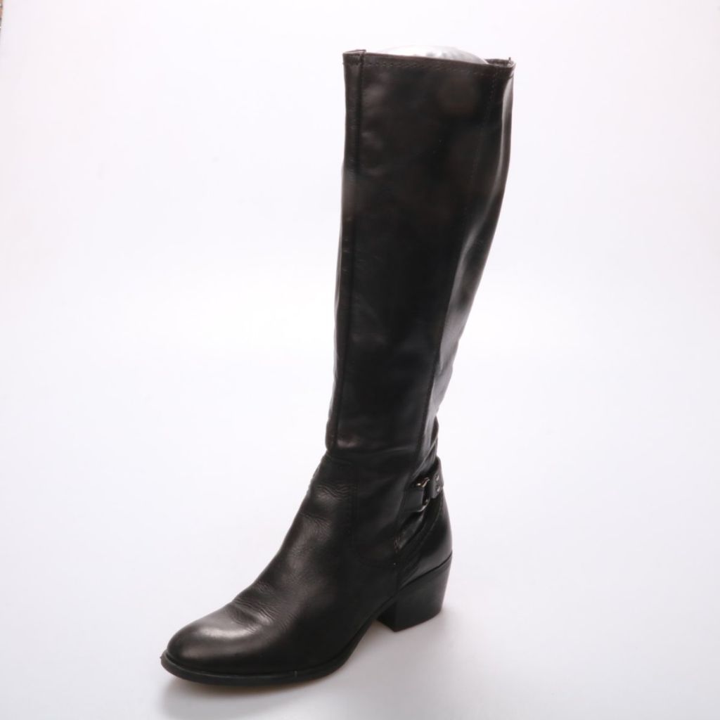 Кожаные сапоги Tamaris в чёрном цвете, длина до колена и устойчивый каблук. Подойдут для повседневной носки в демисезон, хорошо сочетаются с платьями и джинсами. Практичное преимущество — удобная посадка за счёт молнии сбоку.