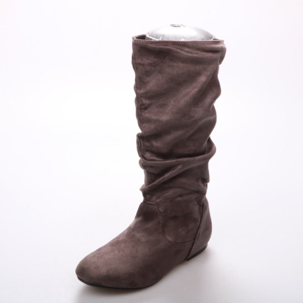 Женские сапоги из замши в коричневом цвете, с мягким присборенным голенищем и боковой молнией. Подойдут для повседневной носки в межсезонье с джинсами и платьями. Молния сбоку облегчает надевание и посадку по ноге.