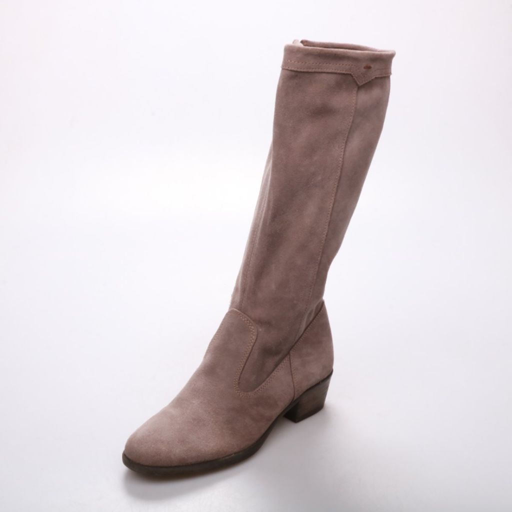 Высокие женские сапоги из замши в бежево-сером оттенке, на устойчивом каблуке и с боковой молнией. Подойдут для повседневной носки в демисезон с платьями и брюками. Практичное преимущество — удобная посадка по голенищу и быстрый надевание за счёт молнии.