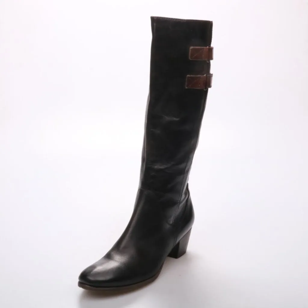 Женские сапоги Tamaris из гладкой кожи на устойчивом каблуке, с застёжкой на молнии и декоративными ремешками сверху. Подойдут для повседневной носки в демисезон, хорошо сочетаются с платьями и джинсами. Практичное преимущество — удобный каблук и прочн...