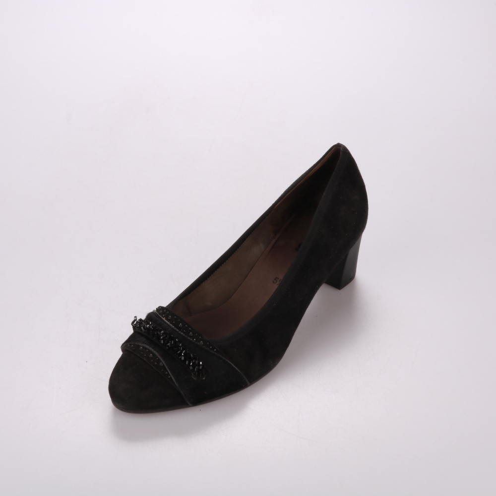 Туфли Gabor из чёрной замши на устойчивом каблуке с декоративной отделкой на носке. Подойдут для офиса и повседневных образов, когда нужен аккуратный классический силуэт. Практичное преимущество — каблук средней высоты удобен для длительной носки.