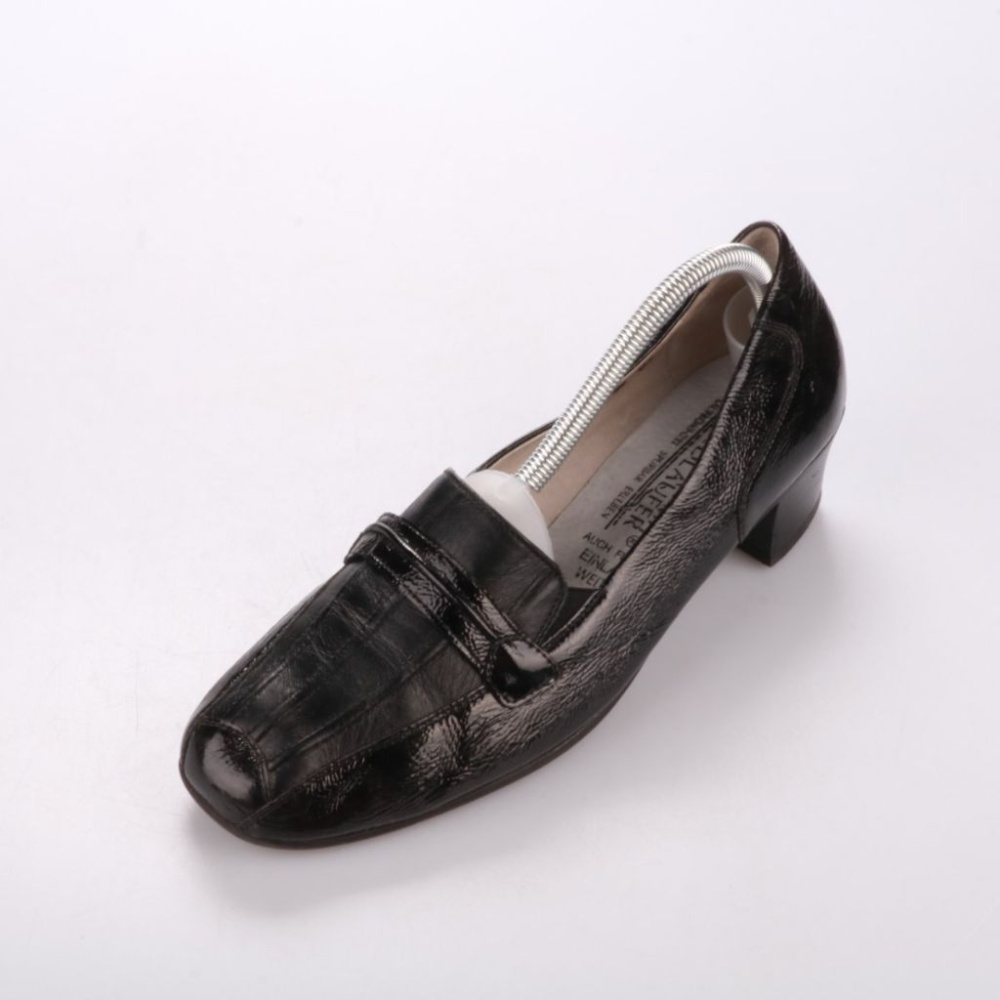Женские туфли-лоферы Waldläufer из чёрной лаковой кожи с тиснением под рептилию и устойчивым невысоким каблуком. Подойдут для офиса и повседневных выходов в межсезонье, легко сочетаются с брюками и юбками. Практичное преимущество — удобная колодка и не...