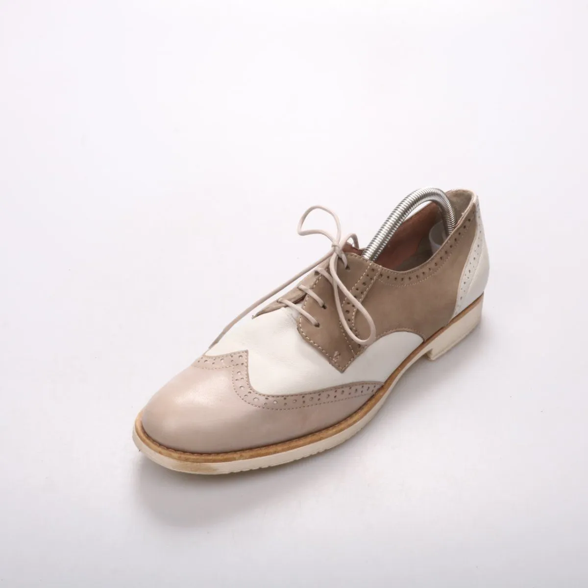 Женские туфли-оксфорды Tamaris в бежево-белой гамме с перфорацией (броги) и шнуровкой. Подойдут для офиса и повседневных образов в межсезонье, хорошо сочетаются с брюками и юбками. Практичное преимущество — устойчивый низкий каблук и удобная посадка за счёт шнуровки.